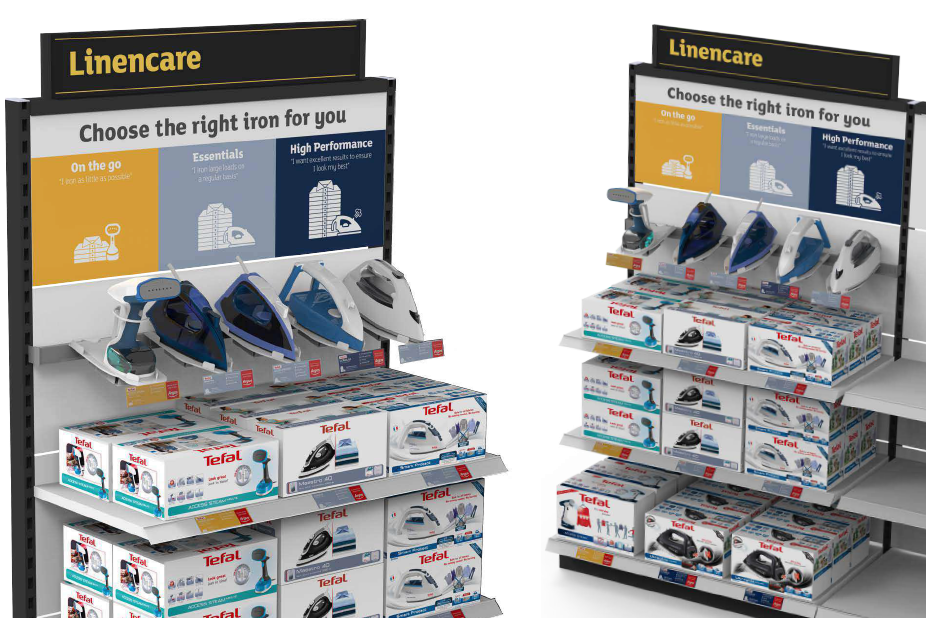 The gondola stand for Sainsbury’s utilises 1 side for Tefal’s Linen Care range. This included 4 irons and 1 garment steamer. The client requested that the irons were to be positioned from “On the go,” to “High performance.” Challenges were ease of consumer handling of the Linen Care products with organised cable management.